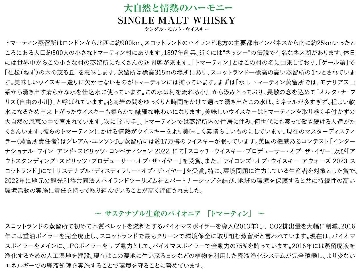 12年以上熟成されたモルト原酒からつくられるプレミアム・シングル・モルト・ウイスキー。程よいピートの香りがまろやかで端正な口あたりを引き出します