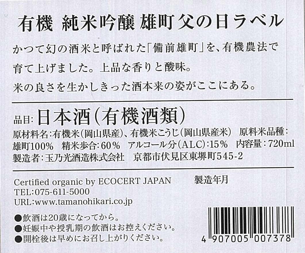5. 【父の日】清酒 玉乃光 有機 純吟雄町父の日ラベル (早割)