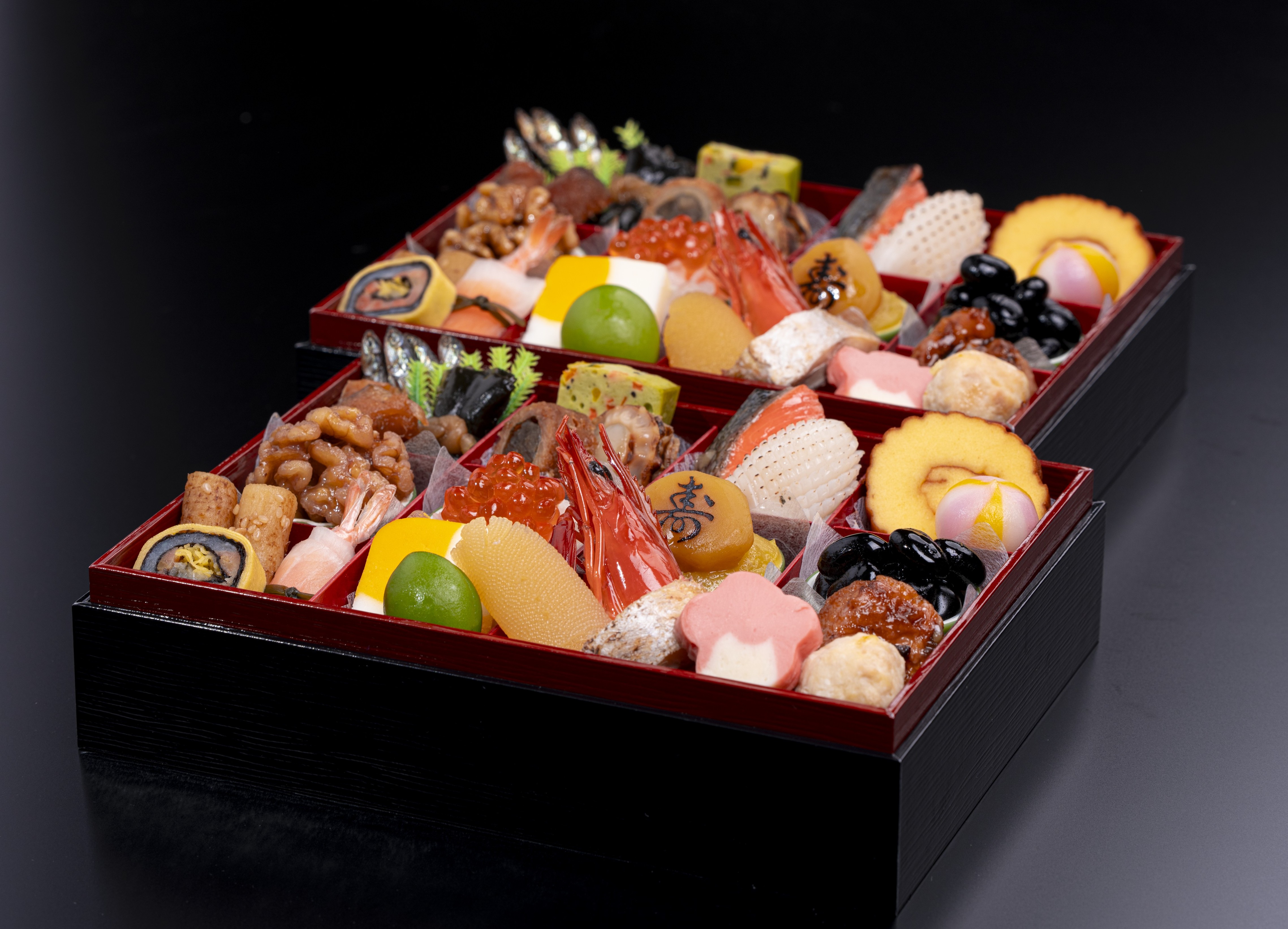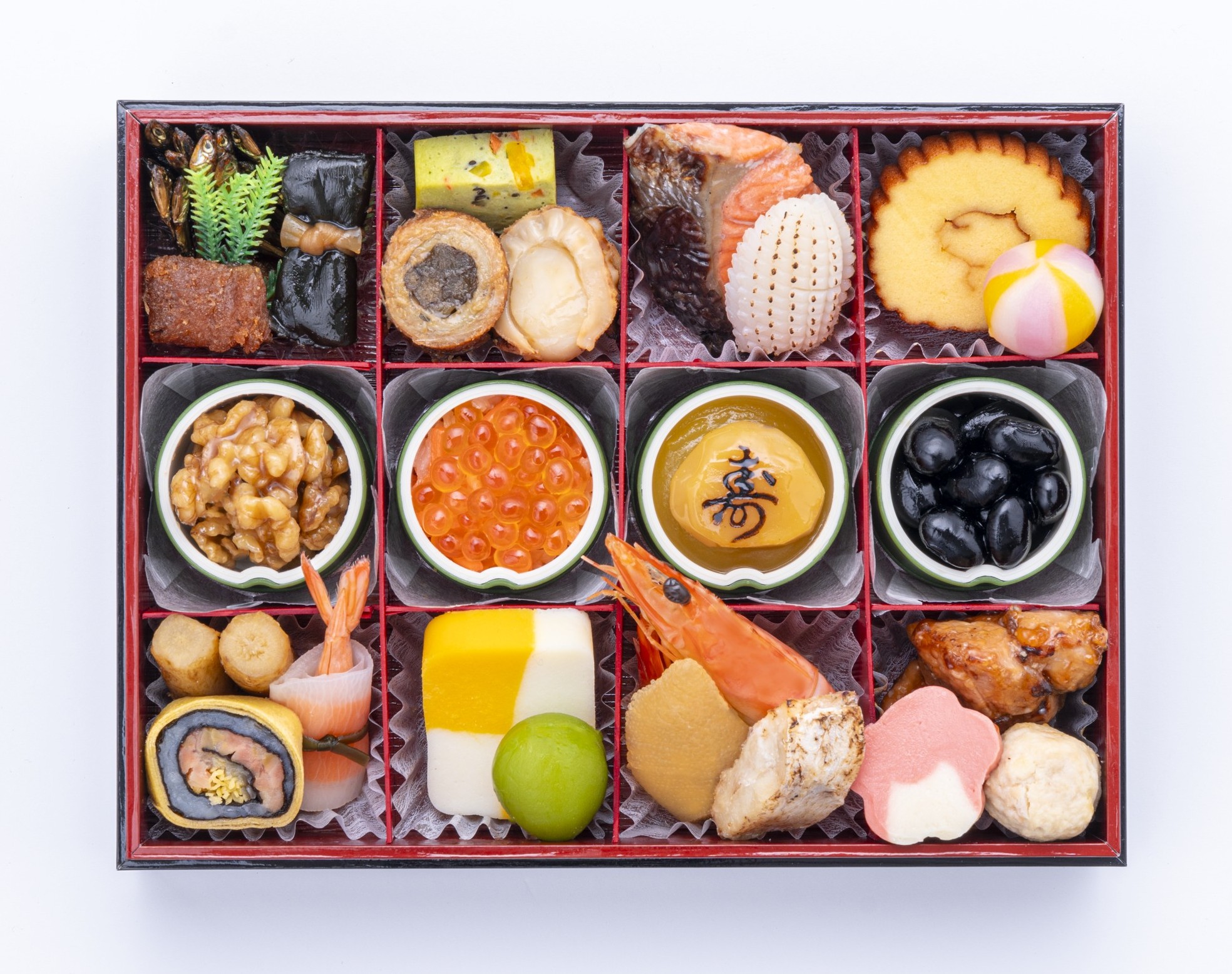 田作り、昆布巻、たら旨煮、新緑ふくさ、穴子八幡巻、焼き帆立、紅鮭白醤油焼、烏賊松笠白焼、伊達巻、手毬餅、くるみ煮、紅白なます、いくら醤油漬、栗金団、丹波黒大豆蜜煮、酢牛蒡、海老紅白奉書、紅白錦糸巻、錦玉子、若桃甘露煮、祝い海老、数の子鼈甲漬、小鯛塩焼、鶏照焼、柚子鶏つくね、梅真丈