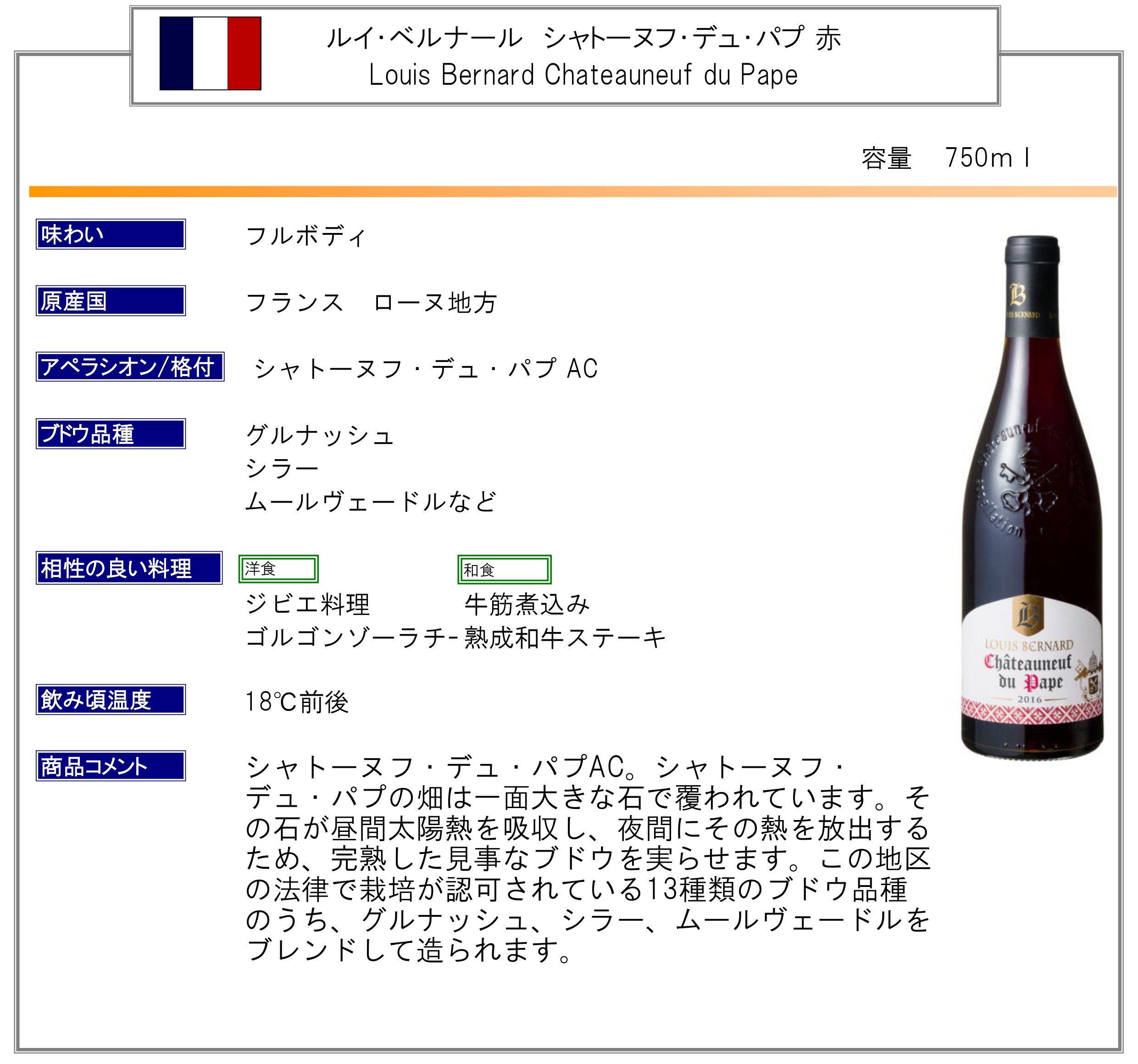 フルボディ。スパイシーで力強いアロマと樽香が見事なワイン。シャトーヌフ・デュ・パプの畑は一面大きな石で覆われています。その石が昼間太陽熱を吸収し、夜間にその熱を放出するため、完熟した見事なブドウを実らせます。この地区の法律で栽培が認可されている13種類のブドウ品種のうち、グルナッシュ、シラー、ムールヴェードルをブレンドして造られます。