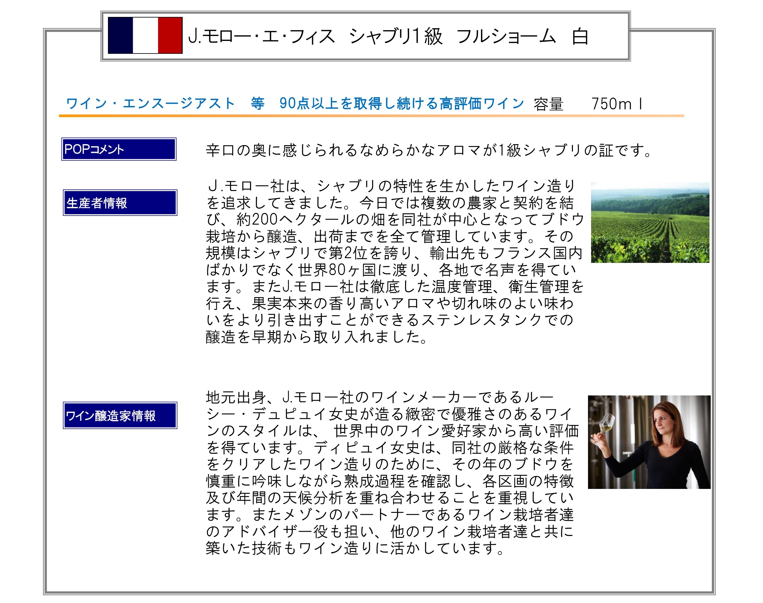 J.モロー社は、シャブリの特性を生かしたワイン造りを追求。今日では複数の農家と契約を結び、約200ヘクタールの畑を同社が中心となってブドウ栽培から醸造、出荷までを全て管理しています。その規模はシャブリで第2位を誇り、輸出先もフランス国内ばかりでなく世界80ヶ国に渡り、各地で名声を得ています。またJ.モロー社は徹底した温度管理、衛生管理を行え、果実本来の香り高いアロマや切れ味のよい味わいをより引き出すことができるステンレスタンクでの醸造を早期から取り入れています。