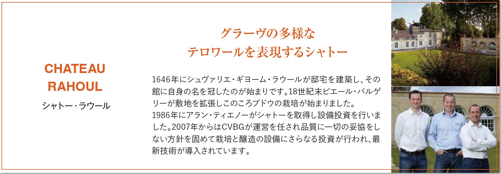 1646年にシュヴァリエ・ギヨーム・ラウールが邸宅を建築し、その館に自身の名を関したのが始まりです。18世紀末ピエール・バルゲリーが敷地を拡張しこのころブドウの栽培が始まりました。1986年にアラン・ティエノーがシャトーを取得し設備投資を行いました。2007年からはCVBGが運営を任され品質に一切の妥協をしない方針を固めて栽培と醸造の設備にさらなる投資が行われ、最新技術が導入されています。