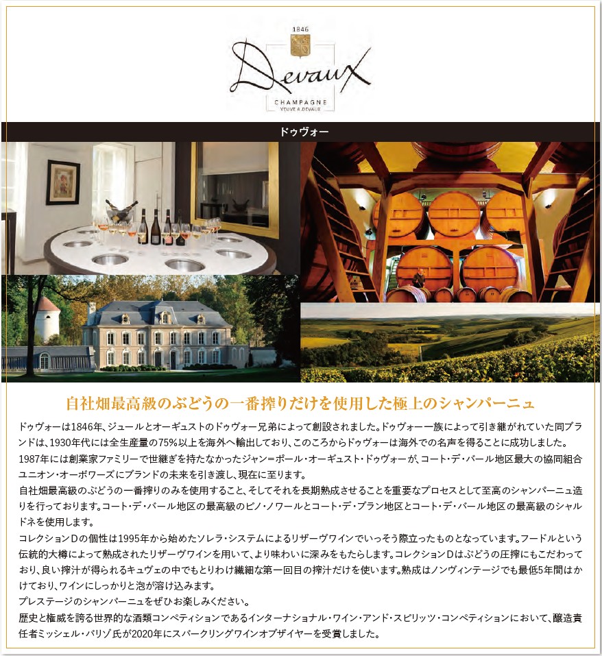 ドゥヴォーは1846年、ジュールとオーギュストのドゥヴォー兄弟によって創設。ドゥヴォー一族によって引き継がれていた同ブランドは、1930年代には全生産量の75%以上を海外へ輸出しており、このころからドゥヴォーは海外での名声を得ることに成功しました。1987年には創業家ファミリーで世継ぎを持たなかったジャン=ポール・オーギュスト・ドゥヴォーが、コート・デ・バール地区最大の協同組合ユニオン・オーボワーズの社長であったローラン・ジレ氏にブランドの未来を引き渡し、現在に至ります。自社畑最高級のぶどうの一番搾りのみを使用すること、そしてそれを長期熟成させることを重要なプロセスとして至高のシャンパーニュ造りを行っています。