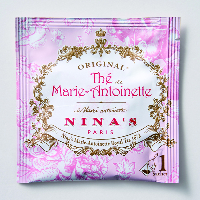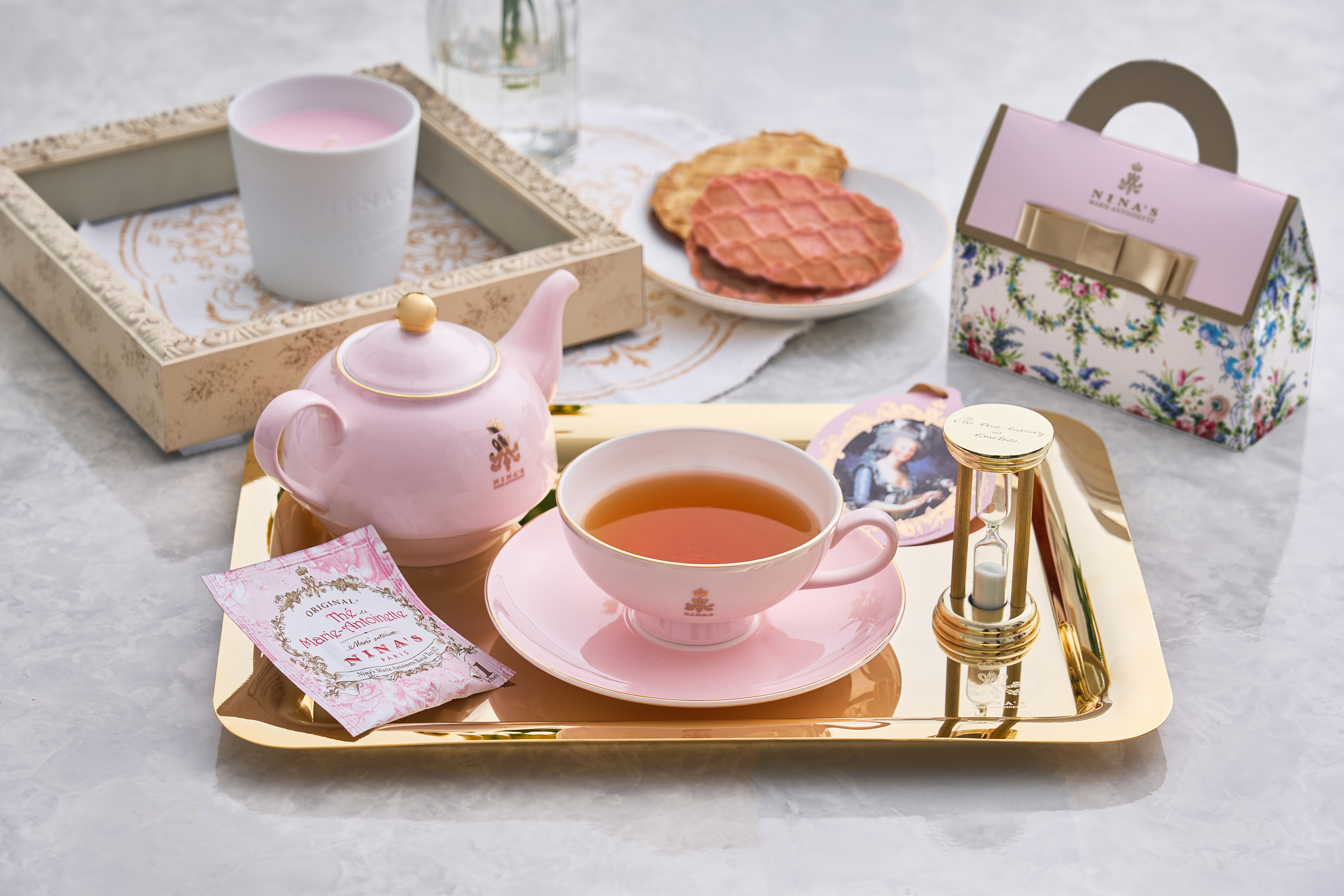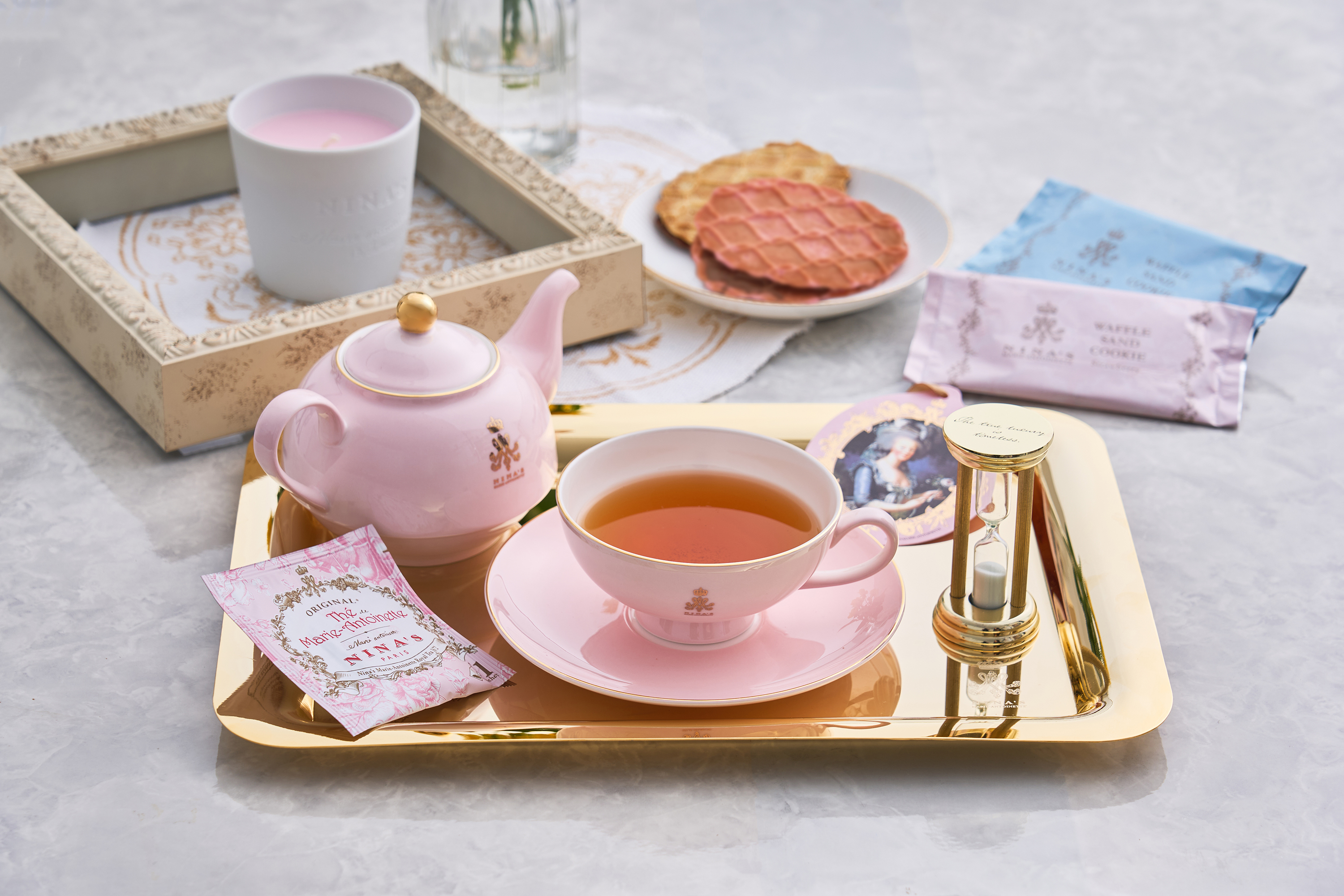 王妃マリー・アントワネットのラグジュアリー・ティーをイメージしたニナスの紅茶と、チョコレートをサンドした香ばしいワッフルクッキーをセットでお届けします。