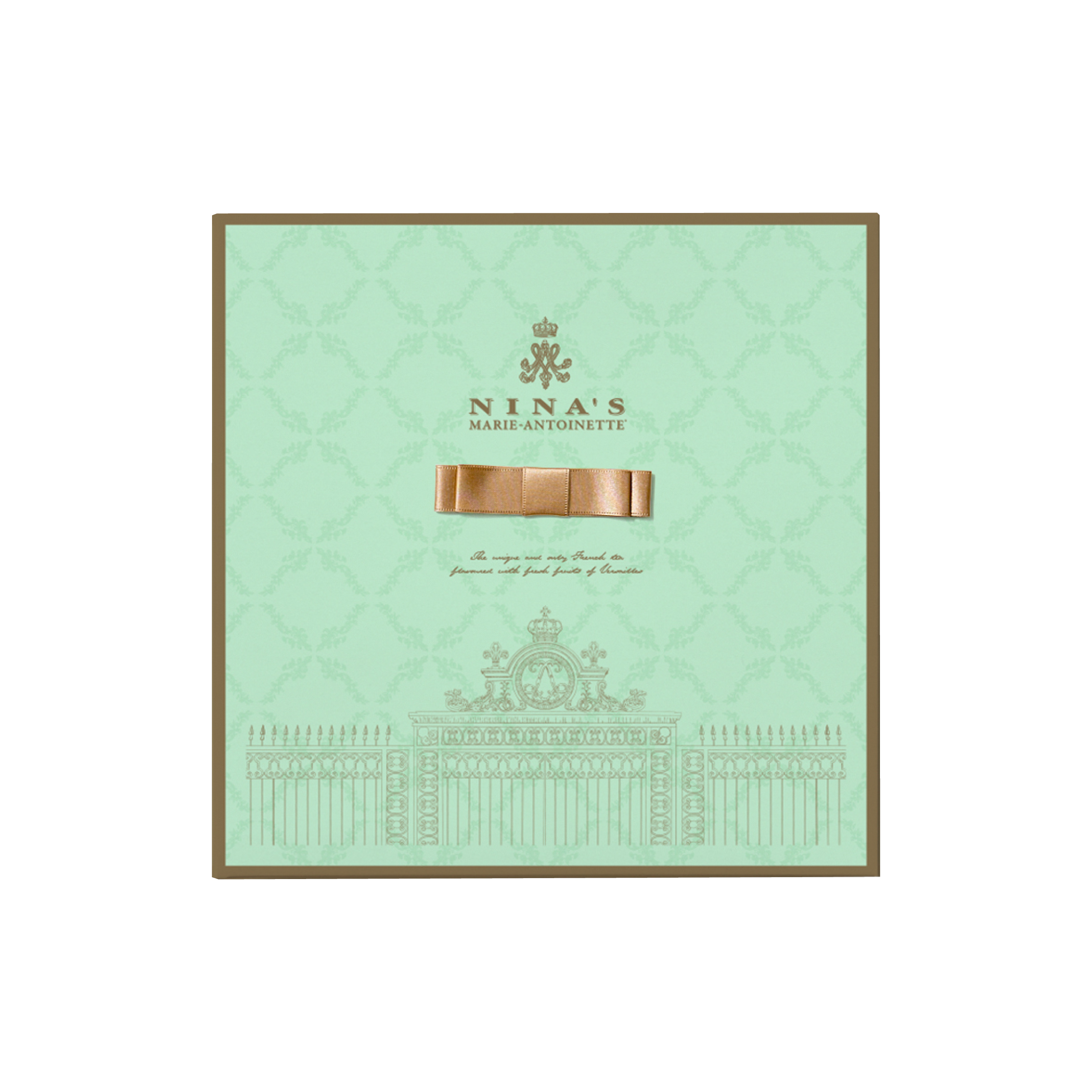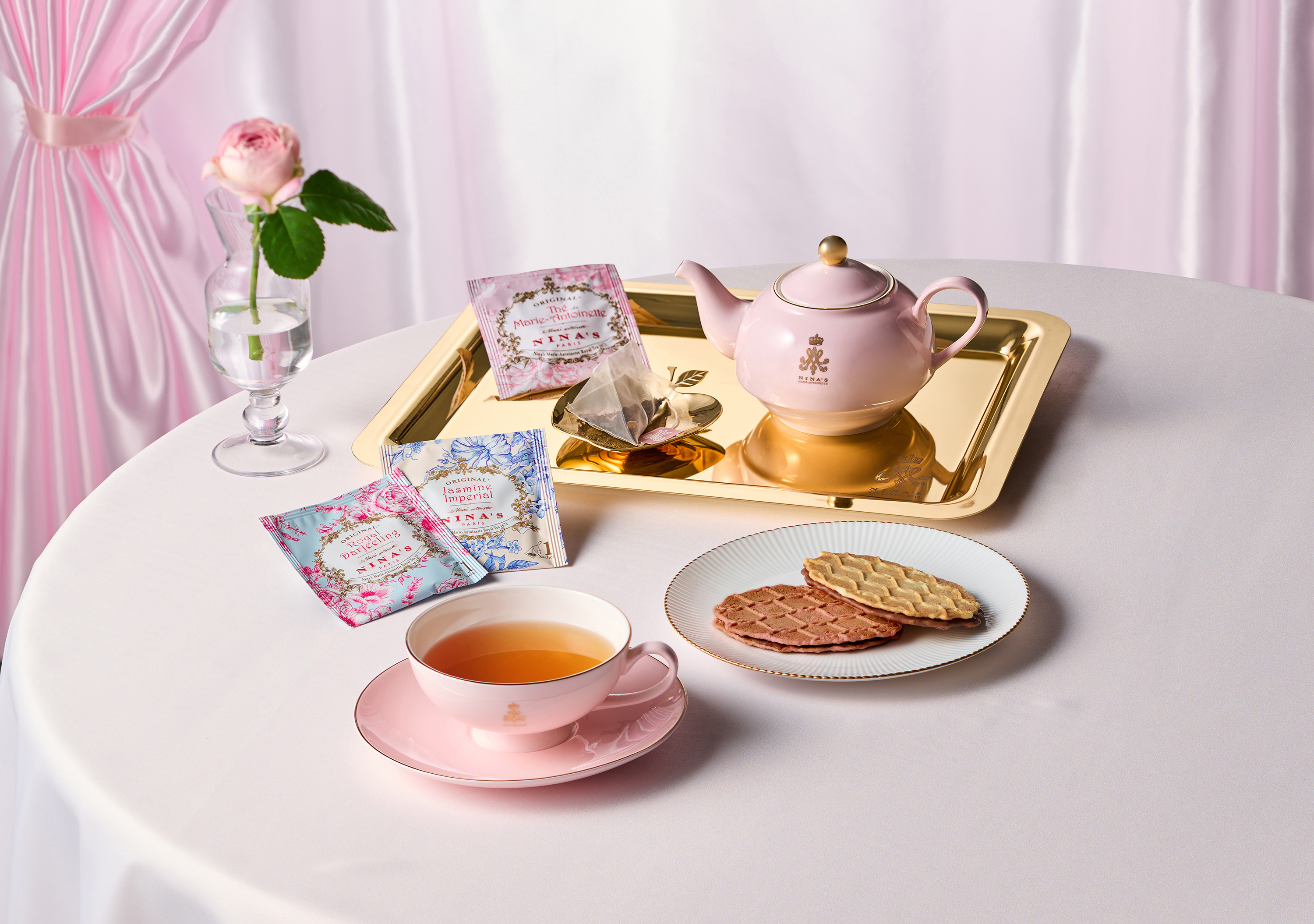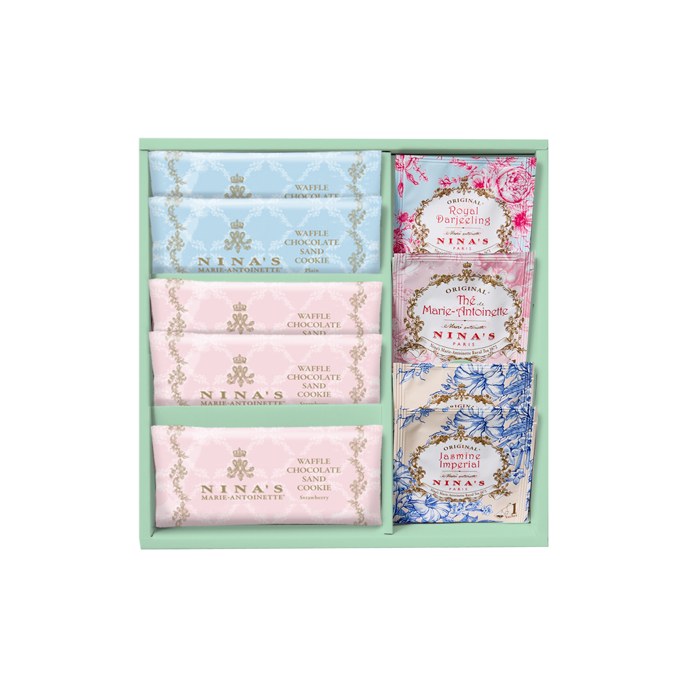 王妃マリー・アントワネットのラグジュアリー・ティーをイメージしたニナスの紅茶と、チョコレートをサンドした香ばしいワッフルクッキーをセットでお届けします。