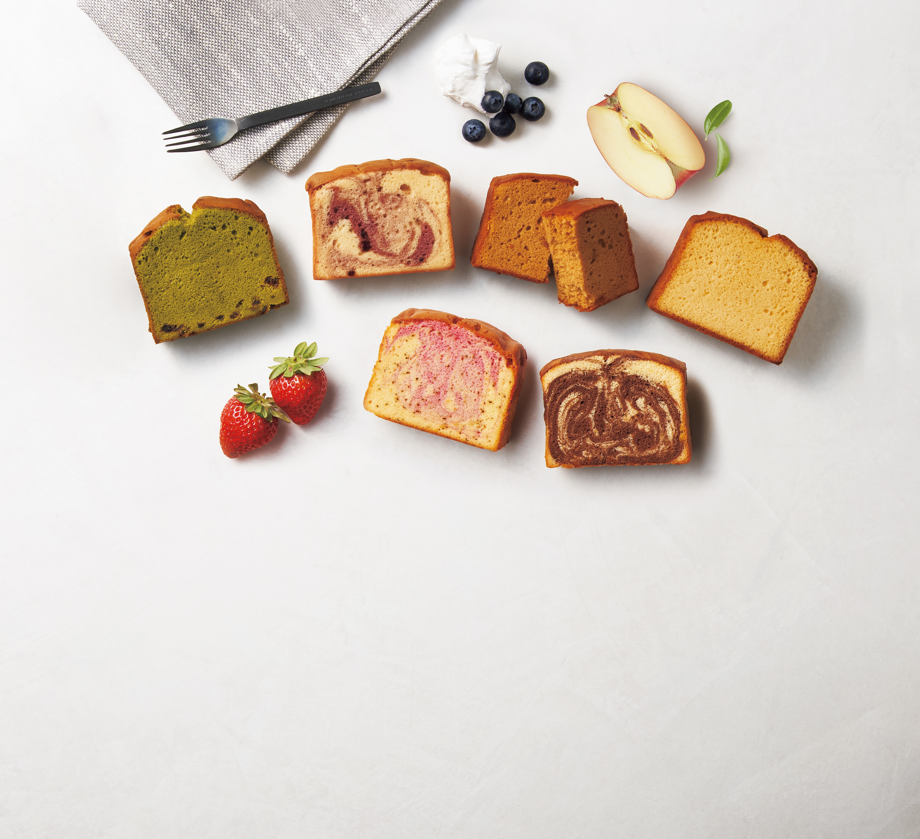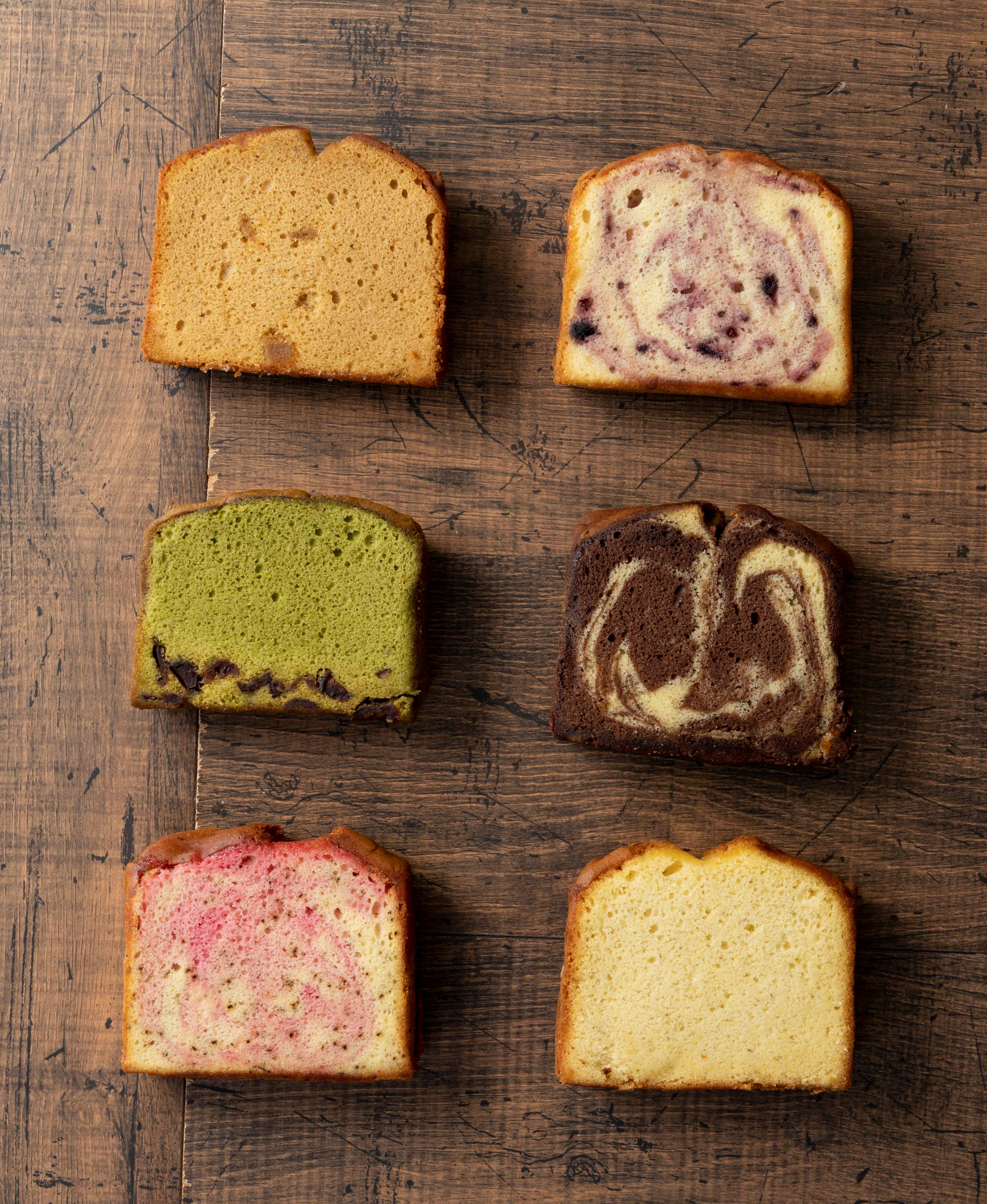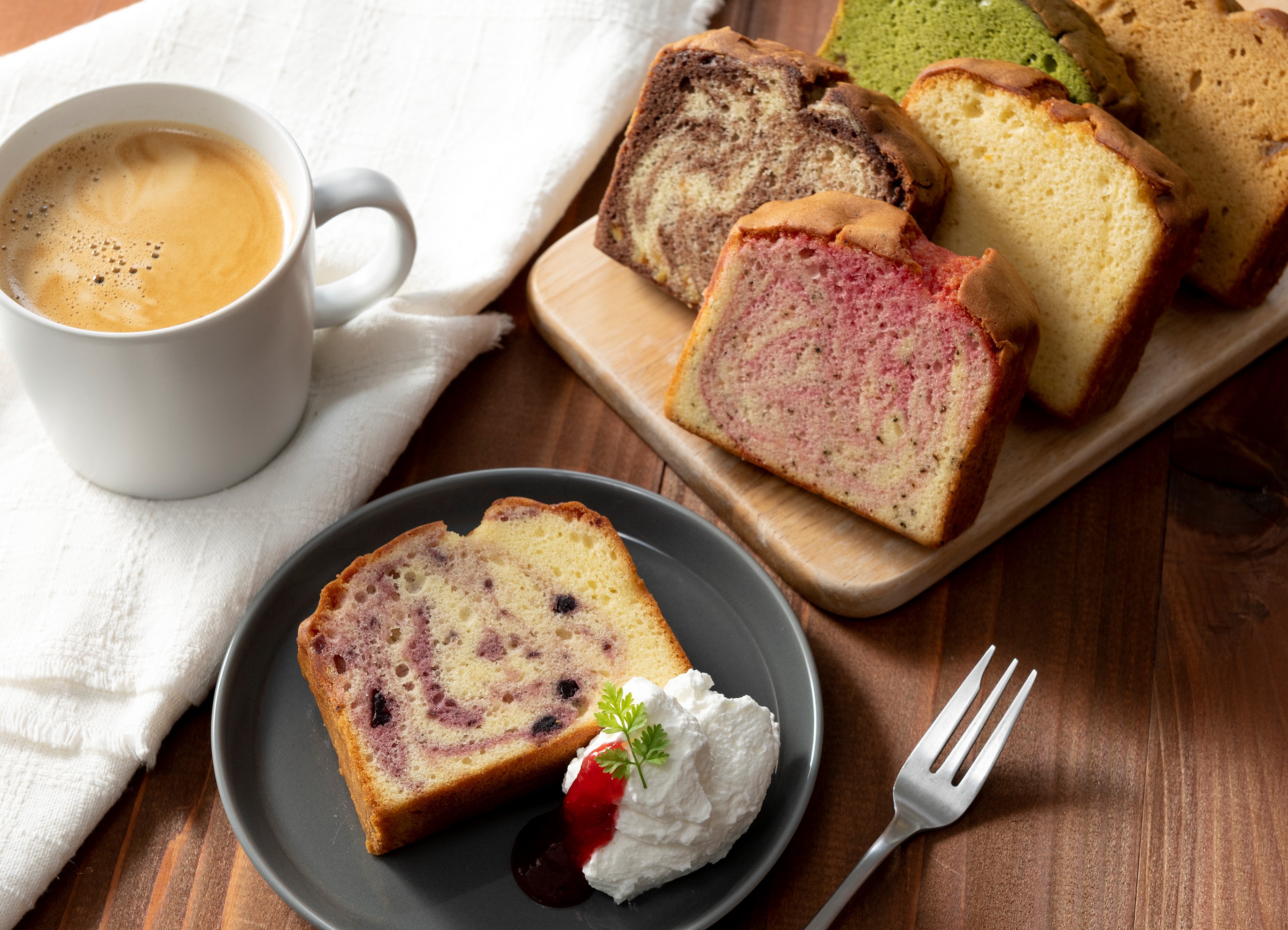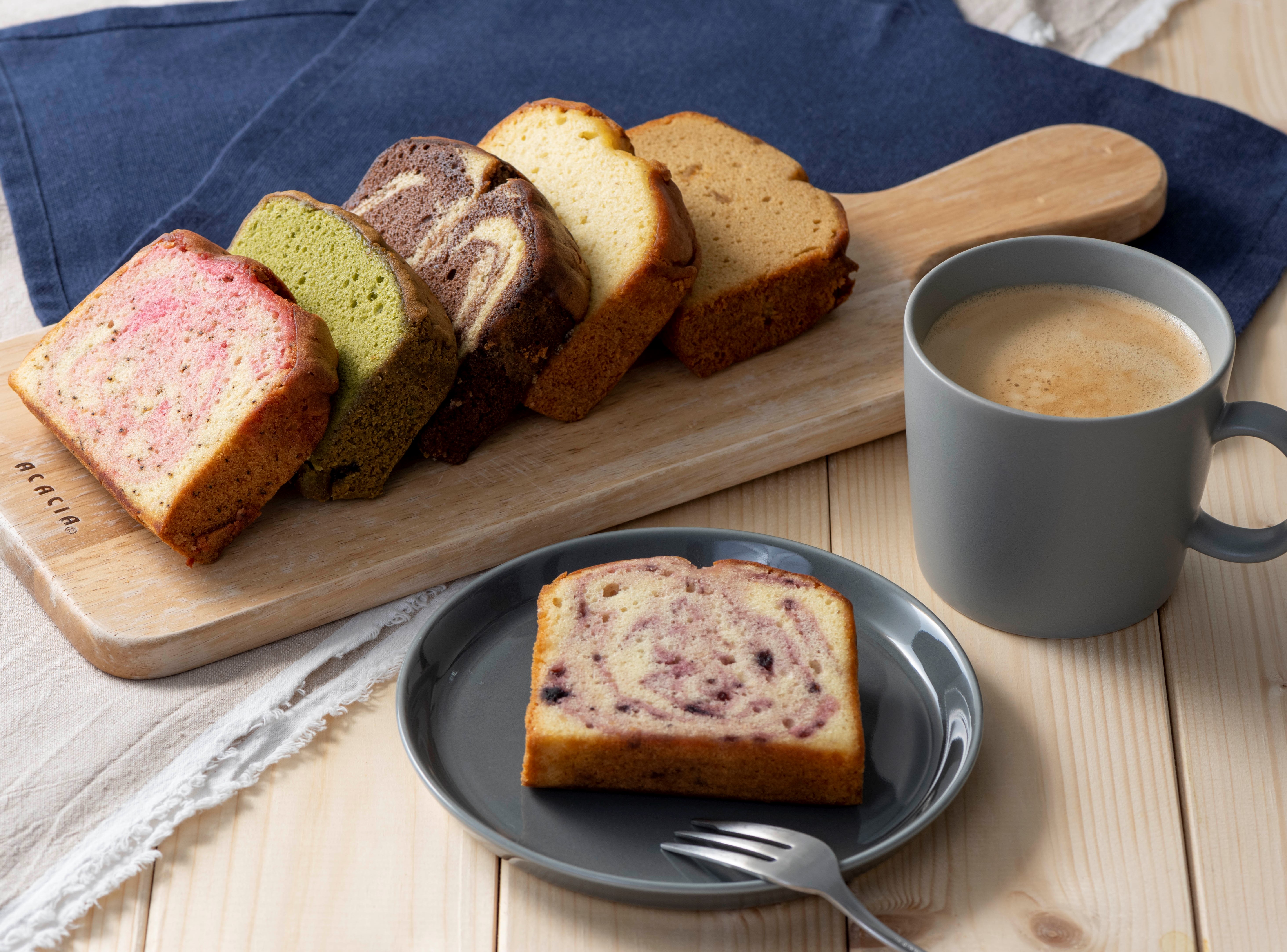 フルーツを混ぜ込んだ大きなしっとりパウンドケーキです。ずっしりとしたサイズ感ですが、ふんわり軽い食感で意外にぺろりと食べられます。朝食代わりやデザートにも。フルーツとフレーバーが組み合わさったそれぞれの味わいをお楽しみください。