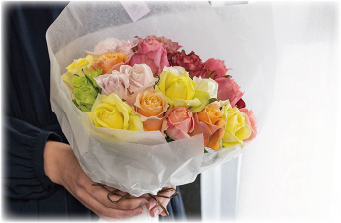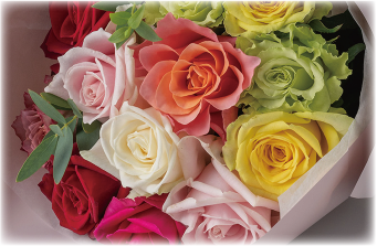 バラ栽培のプロフェッショナルが惜しみない愛情を注ぎ、強く美しいバラへと育てるホシファームのバラ。レッド、ピンク、イエロー、オレンジなど、色とりどりのバラの中から、ギフトに最適なバラを選定し組み合わせるおまかせバラのカラフルブーケです。お部屋をパッと明るく華やかに演出します。まるでドレスをまとったようなふわりと重ねたフリルがかわいいラッピングでお届けします。